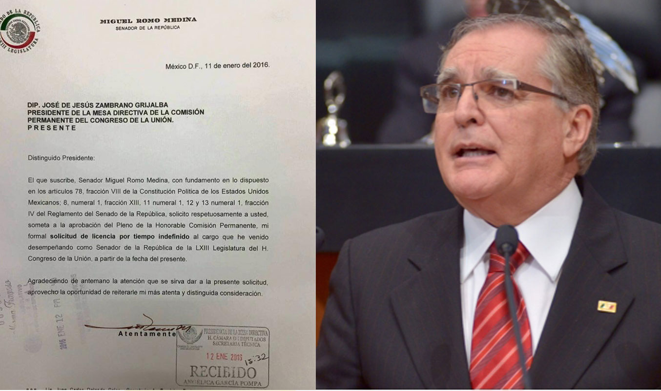 El Senador por el PRI Miguel Romo Medina, presentó el día de ayer su licencia por tiempo indefinido, para dejar su curul en el senado de la república y con ello estar en condiciones de contender como candidato a Gobernador de Aguascalientes.