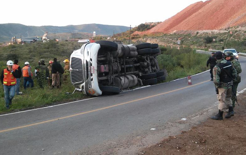 Gran movilización se registró en la carretera federal 22 que conecta el municipio de Rincón de Romos con Asientos. A la altura del Kilómetro 24, el C-4 recibió un reporte de la volcadura de un trailer de una de las empresas mineras y el cual transportaba explosivos.