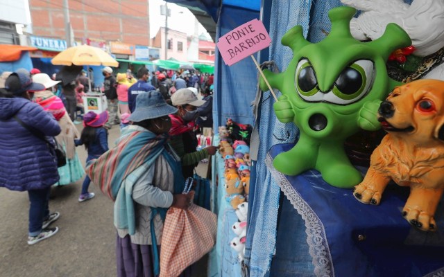 Miniaturas de certificados de salud, tapabocas, pruebas negativas de COVID-19 e incluso alcancías en forma del nuevo coronavirus son parte de la oferta de los creativos artesanos bolivianos para la Alasita, la tradicional ...