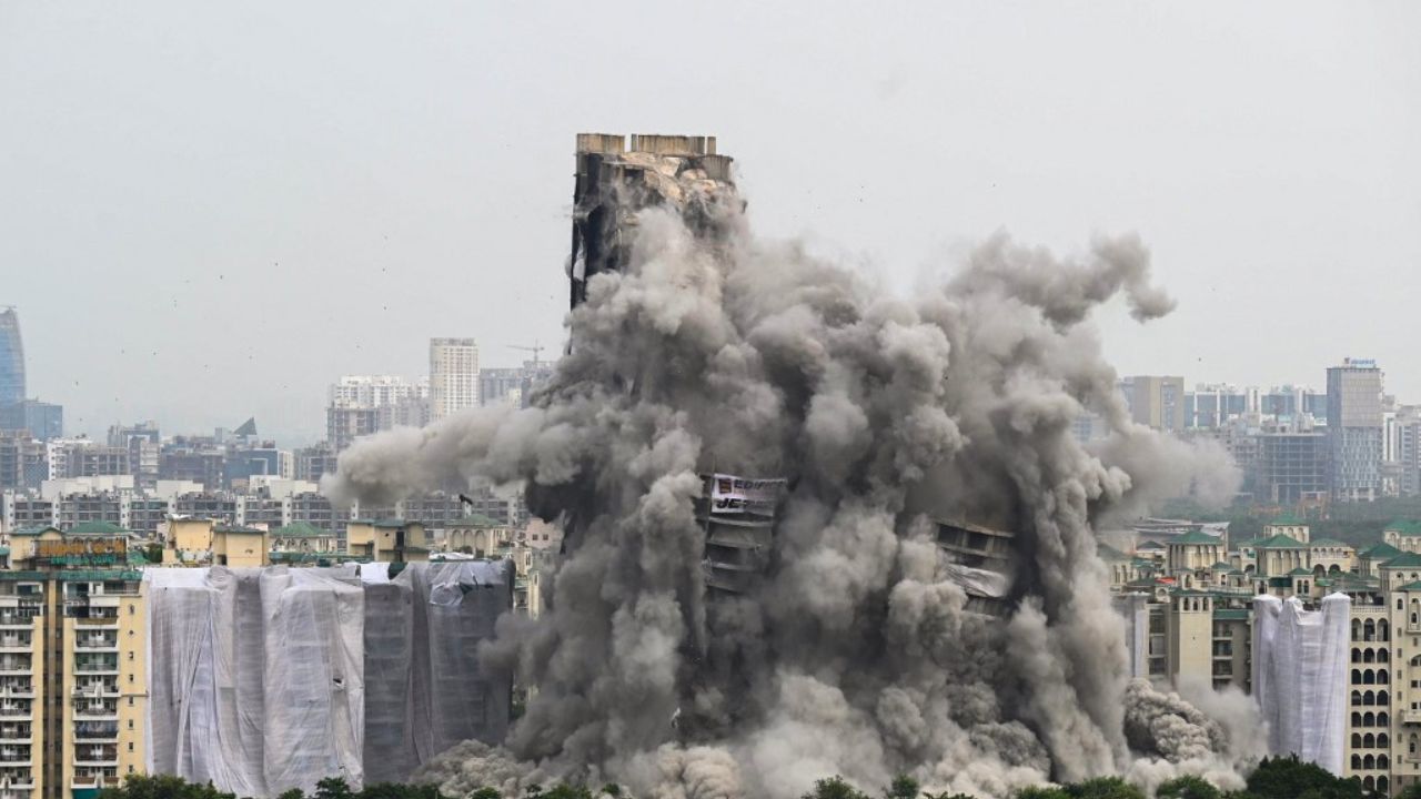 Noida, India. Dos torres destinadas a viviendas, de 100 metros de altura, fueron demolidas el domingo en los suburbios de Nueva Delhi, acontecimiento transmitido en directo por las cadenas de televisión indias.