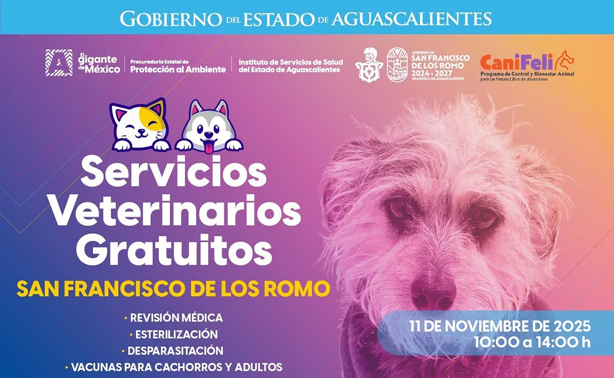¿Quieres que tu mascota reciba atención médica gratuita y de calidad? El Gobierno del Estado te invita a las Jornadas de Servicios Veterinarios Gratuitos que se realizarán en los municipios de Tepezalá, San Francisco de los Romo y Cosío para cuidar la salud de tus compañeros de vida....